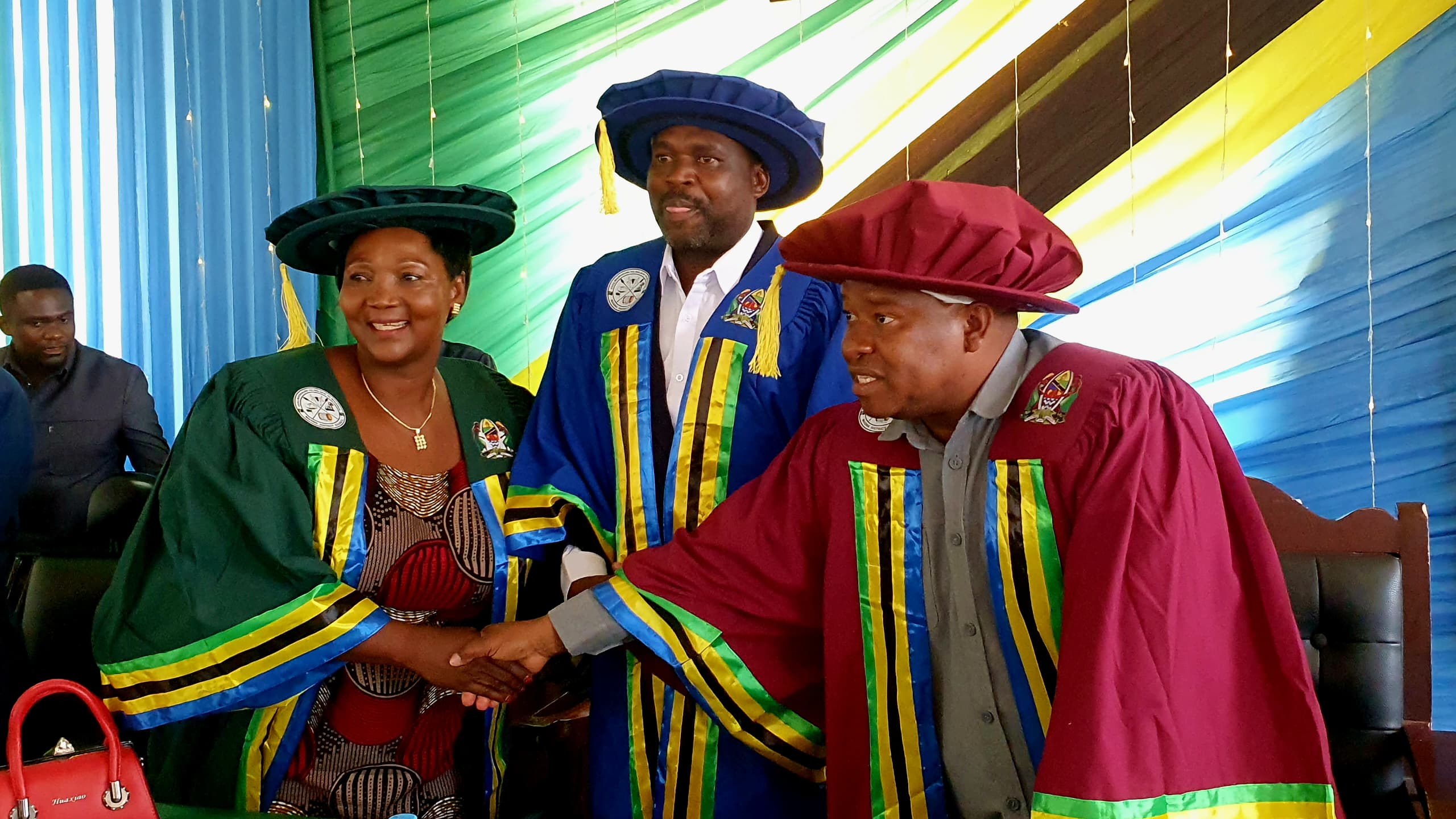 Mkurugenzi Mtendaji wa Halmashauri ya Wilaya ya Maswa Ndg Maisha Selemani Mtipa wa kwa Kulia akitoa mkono wa pongezi kwa Viongozi wateule, wa Katikati ni Mwenekiti Mteule Mhe. Miza Marietha Jishuli na wa kwanza Kushoto ni Makamu Mwenyekiti Mteule wa Halmashauri ya Wilaya ya Maswa Mhe. Mary Misangu Saganda.