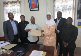 Kaimu Mkurugenzi Mtendaji wa Halmashauri ya Wilaya ya Maswa Ndg. Vivian Christian akikabidhi hati ya kiwanja kwa Afisa Sheria mkuu bohari ya dawa (MSD) na Mwenyekiti wa kamati ya viwanda Bi. Batuli Mu...
